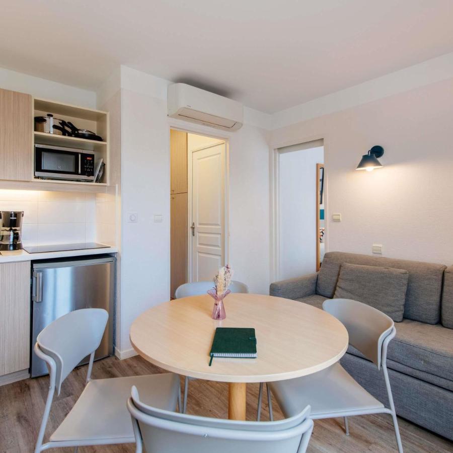 Die Apartments, verteilt auf ein sechsstöckiges Gebäude mit Aufzug, vereinen Komfort und Eigenständigkeit. Es gibt Studios für zwei Personen oder Einzimmerwohnungen, die bis zu vier Personen beherbergen können. Jede Unterkunft verfügt über eine komplett ausgestattete Küche mit Kochplatten, Mikrowelle, Kühlschrank und Geschirrspüler, sodass Sie Ihre Mahlzeiten ganz nach Belieben zubereiten können. Der Essbereich ist so gestaltet, dass Sie Ihre Mahlzeiten in einer einfachen und angenehmen Atmosphäre genießen können.
