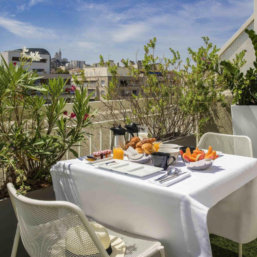 Die geschmackvoll eingerichteten Zimmer bieten allen Komfort, den Sie für eine erholsame Pause benötigen. Die 120 Zimmer sind in den Kategorien Superior, Executive und Suite erhältlich, jedes ausgestattet mit modernen Annehmlichkeiten wie Klimaanlage, LCD-Fernseher, Mini-Kühlschrank und einem Begrüßungstablett. Die Badezimmer verfügen über eine Regendusche, und einige Kategorien bieten Bademäntel, Hausschuhe und hochwertige Toilettenartikel. Die Executive-Zimmer und Suiten verfügen zudem über eine Nespresso-Kaffeemaschine, um Ihren Aufenthalt zu bereichern. Einige Zimmer sind auch mit einer Terrasse ausgestattet, die perfekt ist, um den Blick auf die Basilika Notre-Dame-de-la-Garde zu genießen. Für Familien oder Gruppen bietet das Hotel verbindbare Zimmer, die zusätzlichen Raum und eine flexiblere Organisation ermöglichen.
