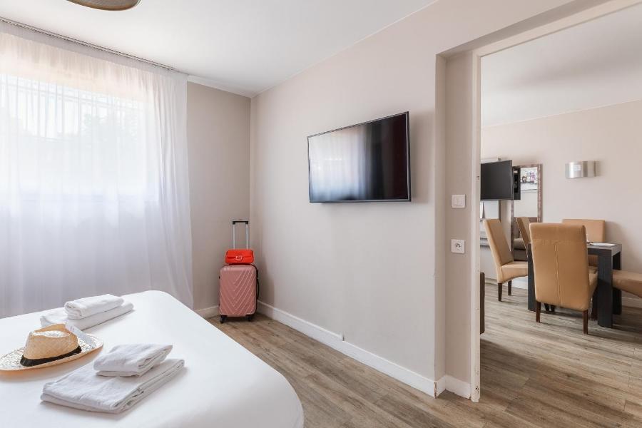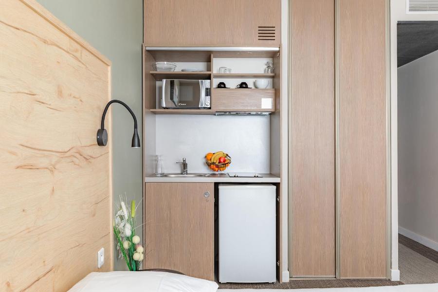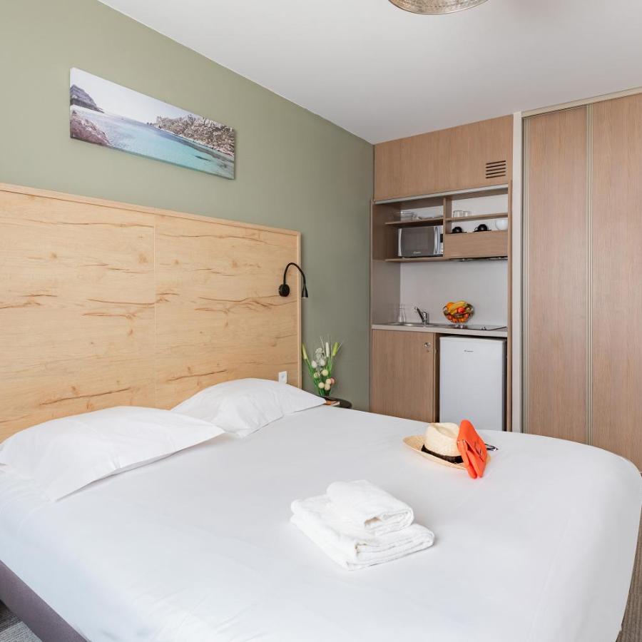 Das Haus bietet 69 Unterkünfte mit schlichter und zeitgemäßer Dekoration. Jede Unterkunft verfügt über eine komplett ausgestattete Küchenzeile, ideal, um Ihre Mahlzeiten in Ihrem eigenen Rhythmus zu organisieren. Je nach gewähltem Appartementtyp finden Sie Glaskeramik-Kochplatten, eine Mikrowelle, einen Kühlschrank, ein komplettes Geschirrset und sogar eine Spülmaschine in den Zweizimmerwohnungen. Diese Ausstattung ermöglicht es, auch mehrtägige Aufenthalte, ob alleine oder mit der Familie, entspannt zu planen.