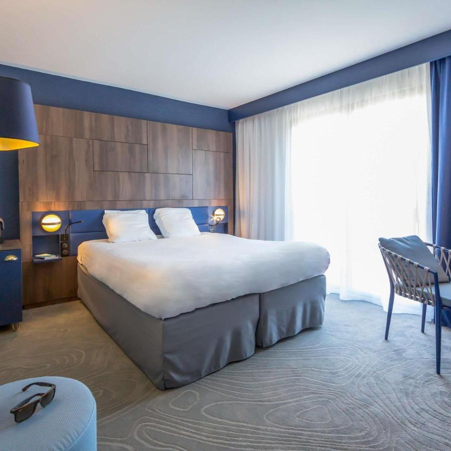 For those seeking more space and amenities, the Privilège rooms offer twenty square meters facing the garden with a balcony or patio. One version accommodates three people with a double bed and a single sofa bed, while another welcomes four people with a double bed and a double sofa bed. These arrangements meet the needs of families or business travelers expecting colleagues.