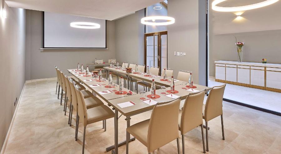For fitness enthusiasts, a well-equipped gym is available for self-service, allowing you to maintain your exercise routines during your stay. Cardio, weight training, and other equipment are provided, and the space offers towels, mineral water, and fruits for your comfort. If you are traveling for business, you will appreciate the hotel’s four meeting rooms, all filled with natural light and equipped with the technology necessary for presentations and conferences. These flexible rooms can adapt to different types of events, from small meetings to large seminars.