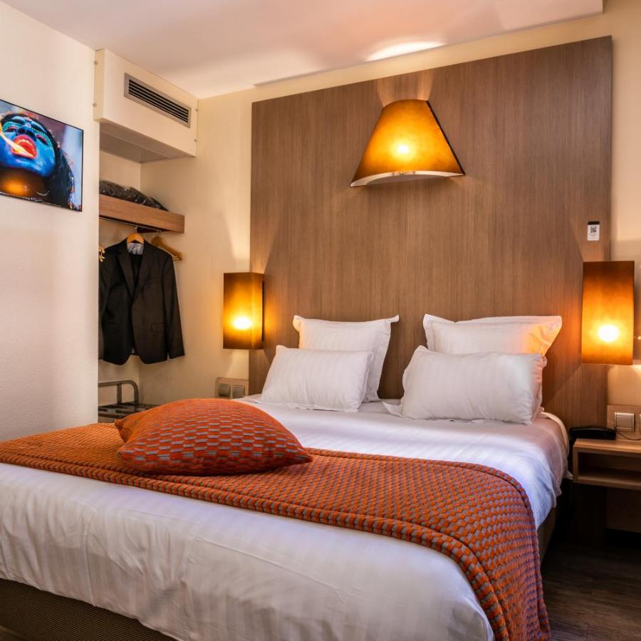 El hotel también dispone de un bar abierto de manera continua, donde podrá disfrutar de una copa o un café en un espacio acogedor. Este lugar de relajación, accesible a cualquier hora, es perfecto para descansar o conversar con otros viajeros. Si prefiere la tranquilidad de su habitación, hay servicio de habitaciones disponible, con platos típicamente franceses como el bœuf bourguignon o la blanquette de veau, para un momento gastronómico sin salir del hotel.