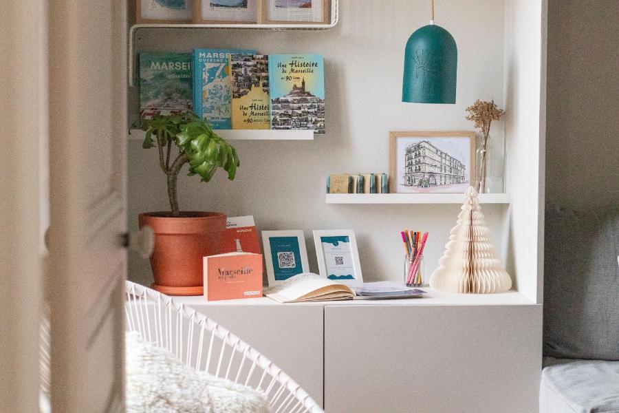 L’atmosphère de la Maison Vague est marquée par un goût prononcé pour l’art et la culture marseillaise. Les murs de l’appartement sont ornés de tableaux et de photographies d’artistes locaux, tandis que des objets chinés ou créés par des artisans de la région enrichissent la décoration. Ces pièces, choisies avec soin, ne se contentent pas d’orner les lieux : elles sont également proposées à la vente, pour les voyageurs désireux de repartir avec un souvenir unique de leur séjour. Cette attention aux détails, ainsi qu’aux artistes et commerçants du quartier, renforce le caractère authentique de la Maison Vague.