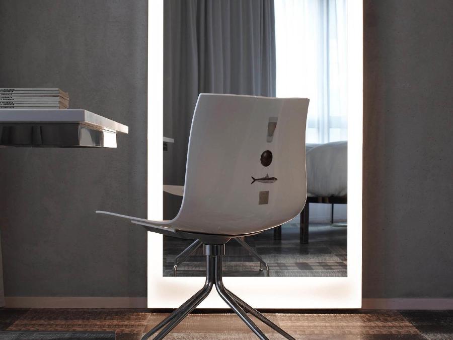 L'immeuble lui-même raconte une histoire marseillaise : ancien entrepôt de boucherie transformé en lieu de vie contemporain, il affiche ses six étages de béton et d'aluminium avec une fierté tranquille. Dès que vous franchissez la porte, l'ambiance caractéristique de la marque vous engloutit. Philippe Starck a signé la décoration des lieux, et son style reconnaissable règne en maître : une débauche contrôlée de fantaisie, mêlant minimalisme urbain et touches de folie assumée. Les couloirs blancs, noirs et gris vous guident jusqu'à votre chambre, ponctués de motifs de sardines et de créatures marines en métal. Des bouées gonflables pendent au plafond du restaurant, des superhéros en celluloïd ornent les murs, des inscriptions à la craie griffonnent le plafond des espaces communs. Cet enfantillage revendiqué crée une atmosphère où la détente côtoie la créativité, loin de l'austérité stérile.
